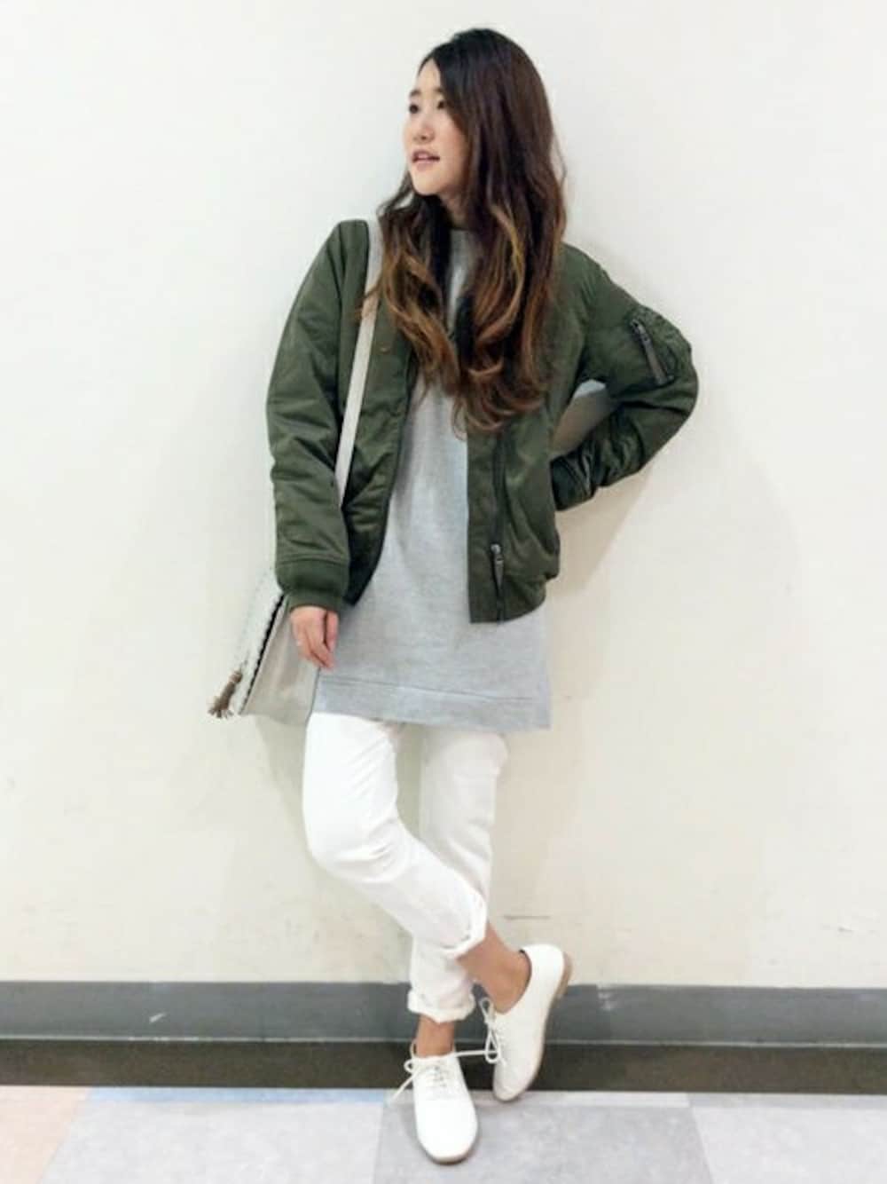 さりげないミリタリー感が今年らしいパンツスタイルです。 スウェット×パンツのシンプルなコーディネートも、トレンドのMA-1をあわせると今年らしさがグッとUP♪ 一見、ハードなイメージのアウターですが、コンパクトなのでパンツはもちろん、いま人気のワイドボトムとも相性◎です。
