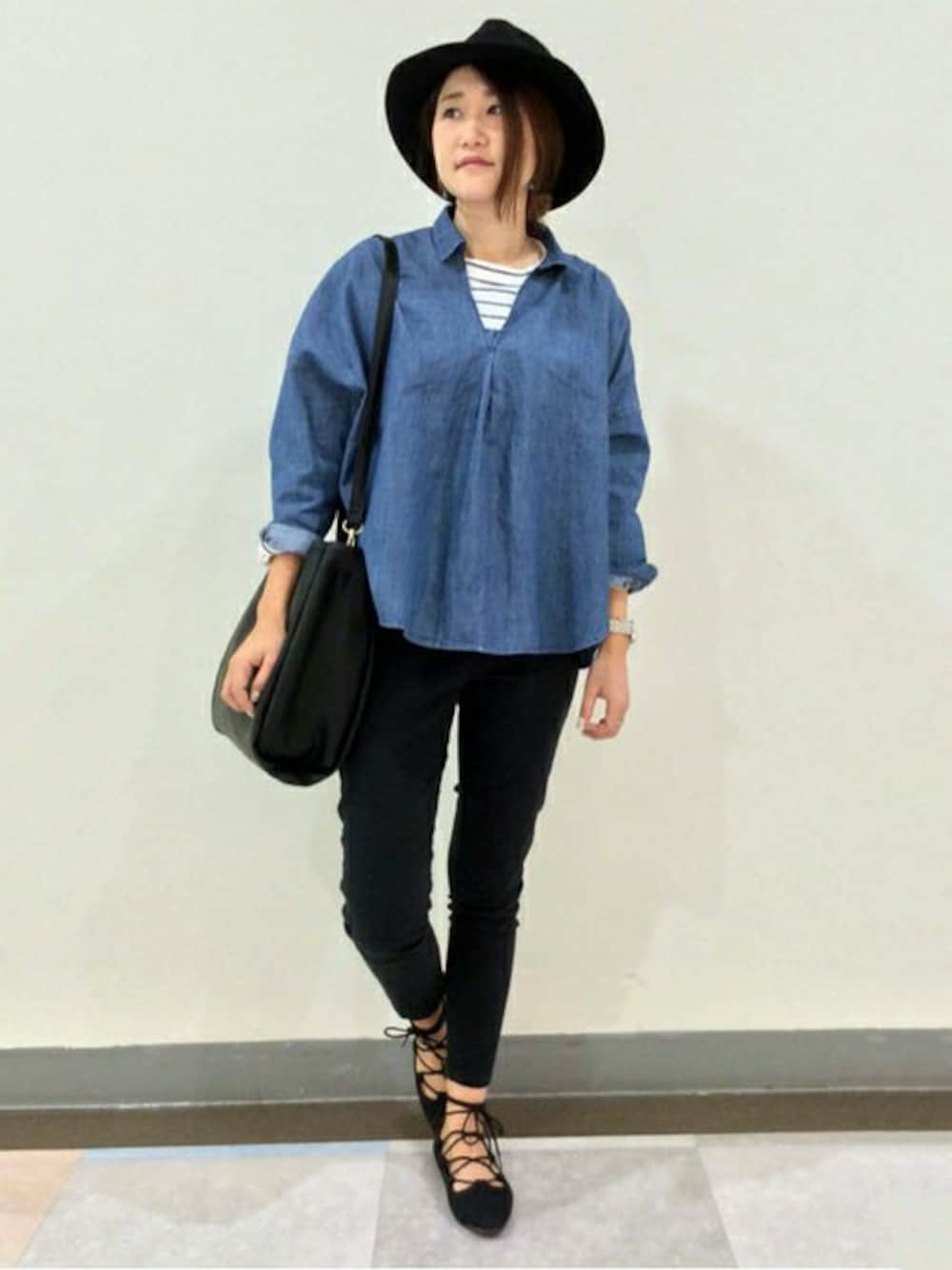クロ×デニムのオトナカジュアルコーディネートです。 この春注目のデニム素材。スキッパーシャツなら程よいカジュアル感を演出できます。 小物は、つば広ハットや編み上げパンプスで女性らしい雰囲気をプラスしました♪