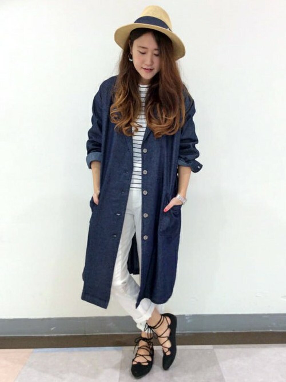 春のトレンド「デニム」素材のコートスタイル。 今年らしい長めの丈でキレイなシルエットを演出してくれるアウターに、これからのシーズンにピッタリのホワイトパンツをあわせました。 足元は、黒い編み上げパンプスでキュッと引き締め、気分を上げてお出かけしましょう♪