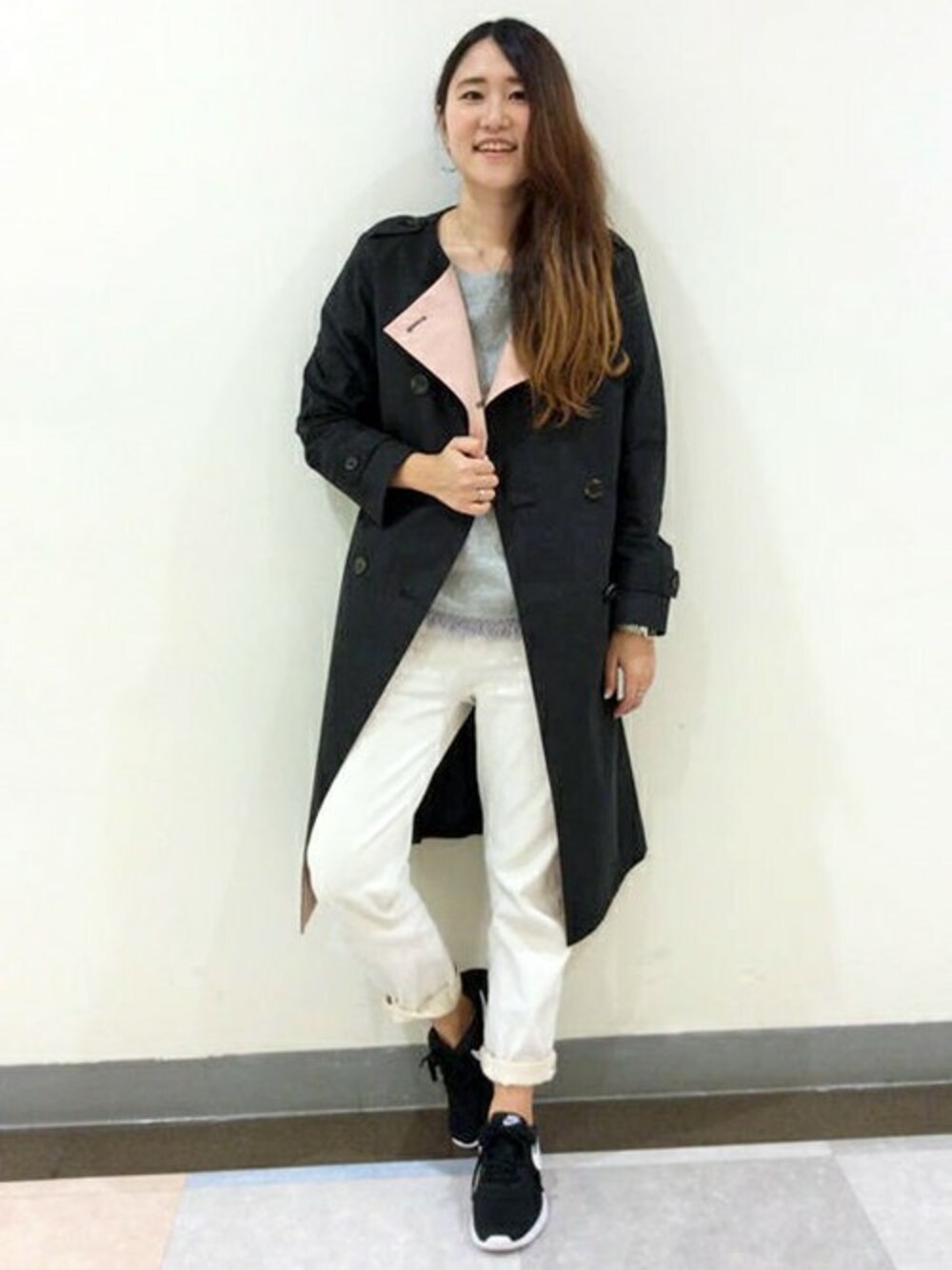 春の定番トレンチコートをカジュアルダウン♪ 注目は、トレンチでは珍しいノーカラーデザイン。 カチッと感が軽く、女性らしい柔らかい雰囲気を演出してくれます。 内側と外側とで色が違うので、サラッと羽織ってデザイン性をアピールする着こなしがおすすめです。