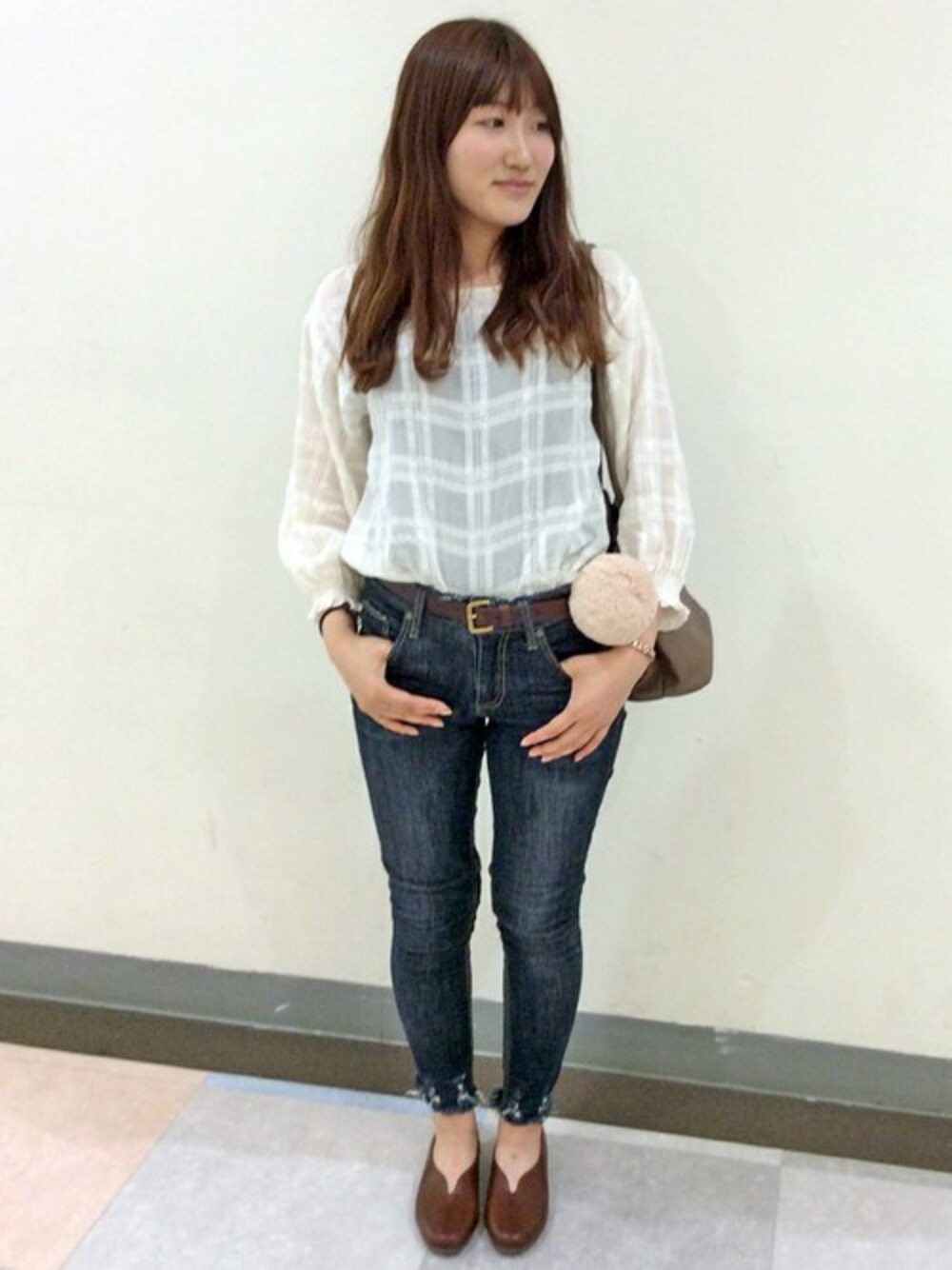 シャドーチェックのブラウスを使ったコーディネート。 程よい透け感があり清涼感◎ 細身のデニムにとトップスインしてキレイめカジュアルにまとめてみました♪
