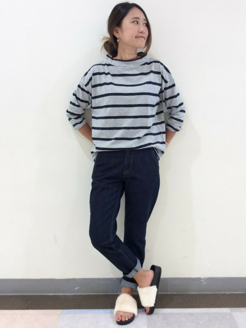 HARUのTシャツ/カットソー「コットン21スラブボーダースタンドネックプルオーバー」を使ったコーディネート