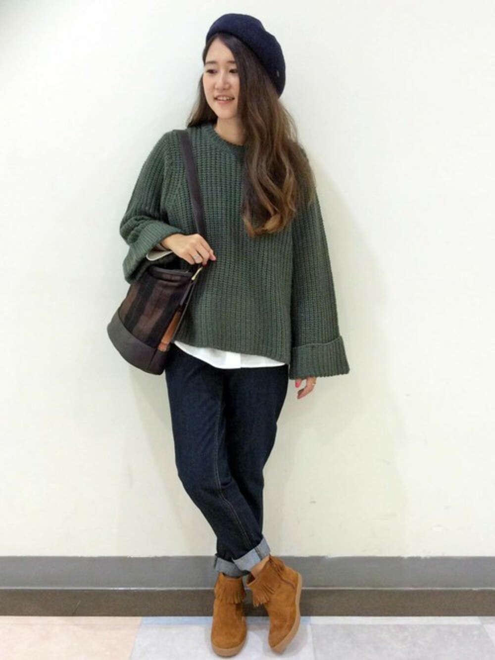 トレンドの袖シルエットがポイントのニットは、季節感を満喫できるカーキをチョイス。 シャツをレイヤードすることでカジュアルに着こなしてみました。 ベレー帽+フリンジブーツをあわせると今年らしさがさらにUPします♪