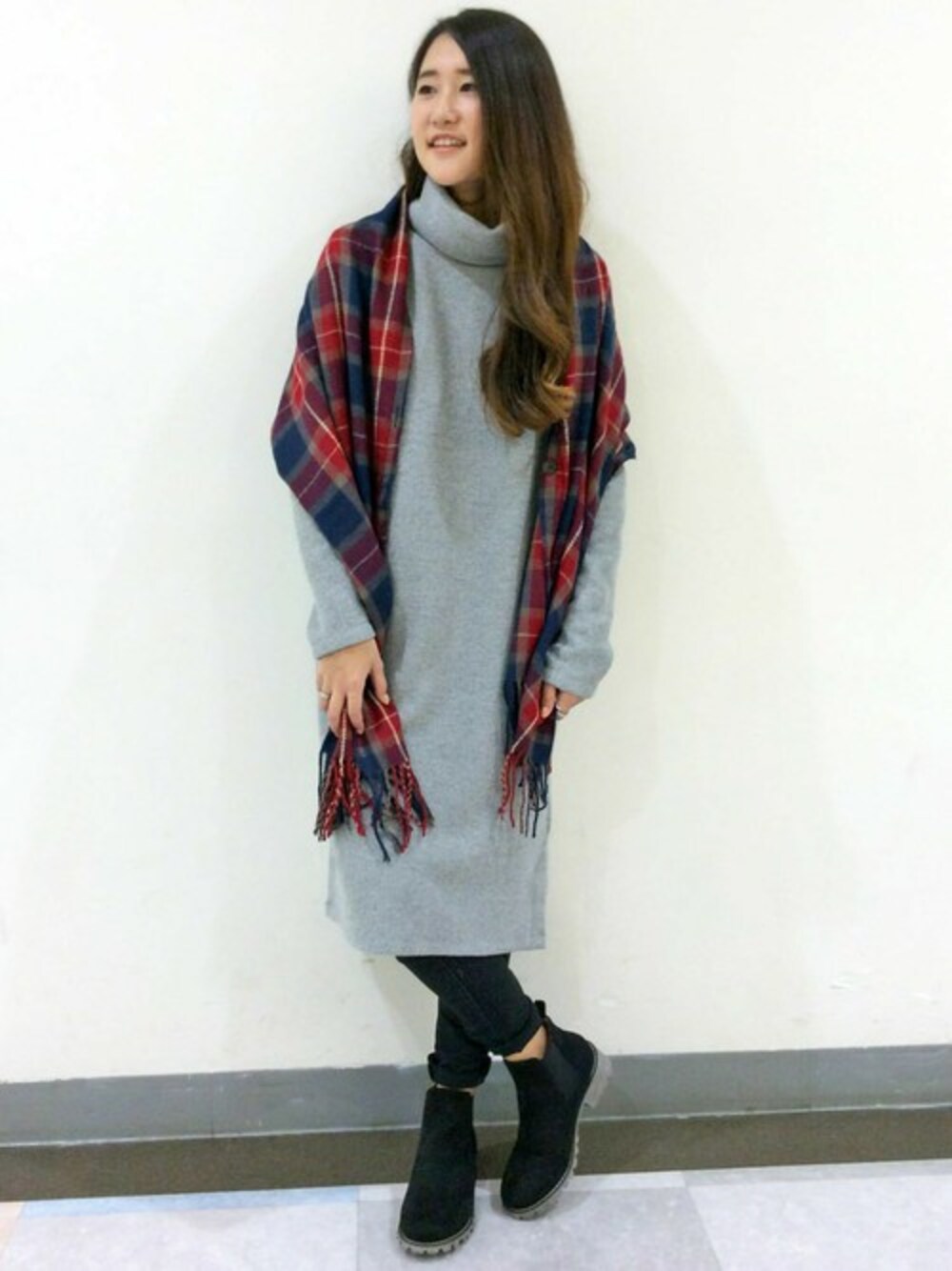 シンプルなニットワンピースに大判ストールをあわせたリラックススタイル。 冬にうれしいタートルネックワンピースは、ライトなグレーをあわせればカジュアルにもきれいめにもコモノ次第でアレンジOK♪ ストールは、永遠の定番でもあるタータンチェック。首に巻いたりひざ掛けにしたりするのはもちろん、ボタン付きなのでポンチョのように羽織ることもできます。