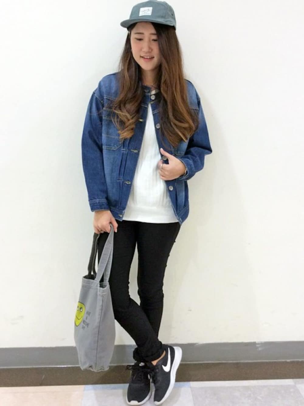 モノトーン+デニムのボーイッシュスタイルです。 春アウターとして人気のデニムジャケットは、ノーカラーでスッキリとした印象です。 小物は思いっきりスポーツテイストであわせ、ヘアはダウンスタイルで女の子らしさをプラスしてみました♪
