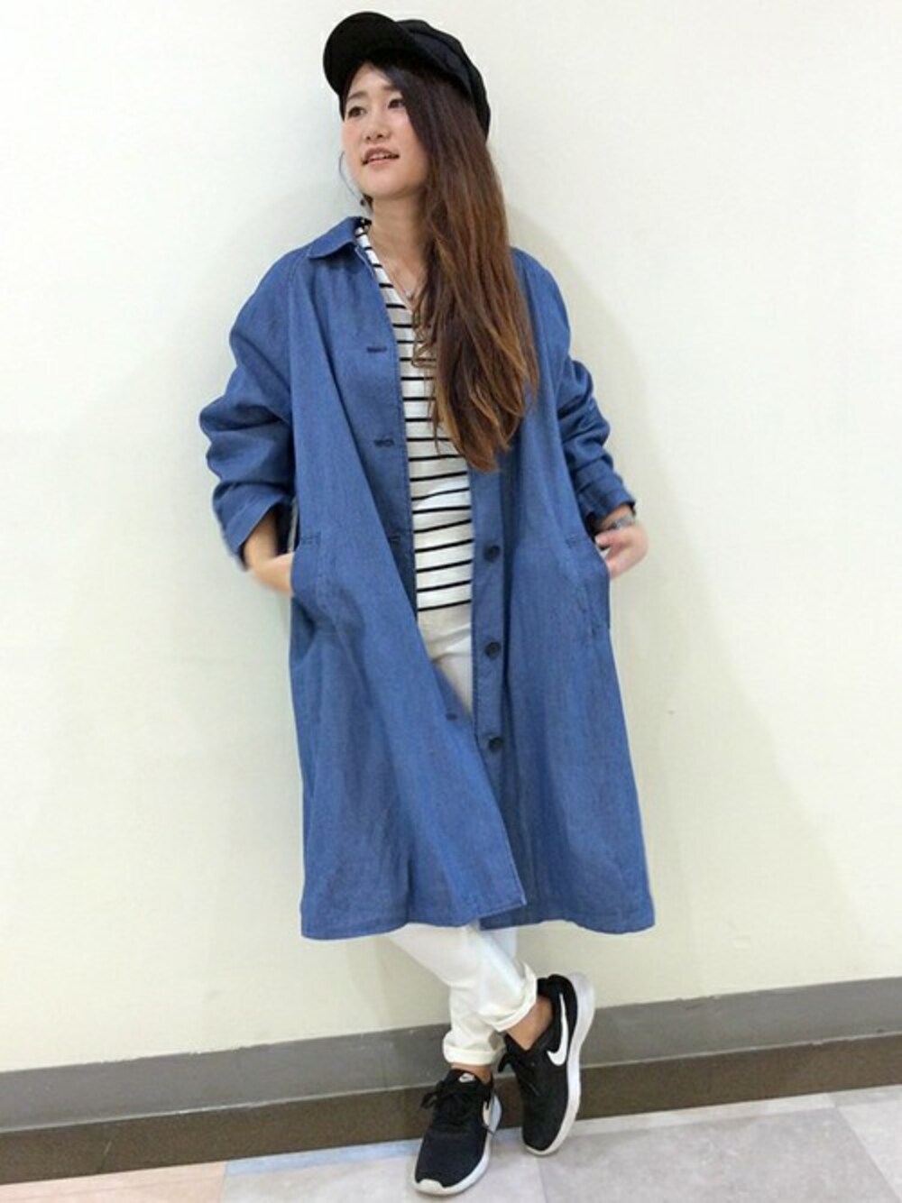 デニム×ホワイトでまとめたボーイズスタイル♪ デニム素材のショップコートは、ウエストベルト付きで、背中はトレンチコートのような2枚仕立てとディテールも本格的。 どんなテイストにも合わせやすいので、キャップ&スニーカーで思いっきりスポーツミックスを楽しむのも◎
