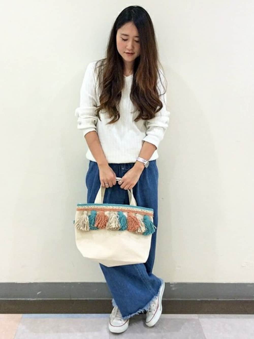 シンプルコーデにリゾートバッグをプラスしました。 カジュアルな印象のホワイト×デニムのスタイリングもトップスをニットにすることで女性らしい雰囲気になります。 主役は、エスニック感のあるリラキャンベルのキャンバスタッセルバッグに♪
