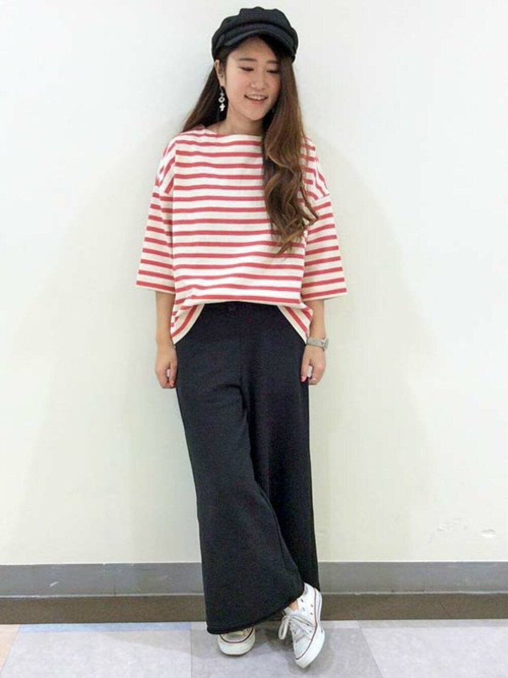 春夏人気の高いボーダーをメインにしたコーディネート。 ボーダーTは、マリンな雰囲気のボートネック、ゆったりのドロップショルダーやボックスシルエットなど、今年らしく見える要素満載♪ 定番のブルー系をアカ系にしてガラッと印象をかえてみました。