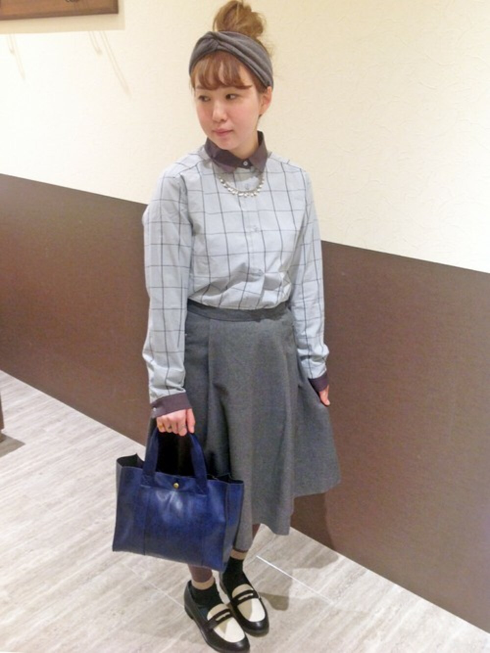 全体をグレートーンでまとめました。 クレリックシャツは淡いグリーンが春らしさ全開です♪ 膝丈フレアースカートは1枚持っているととても便利ですよ。 フェイクポケットのジップがモードな雰囲気を演出します。