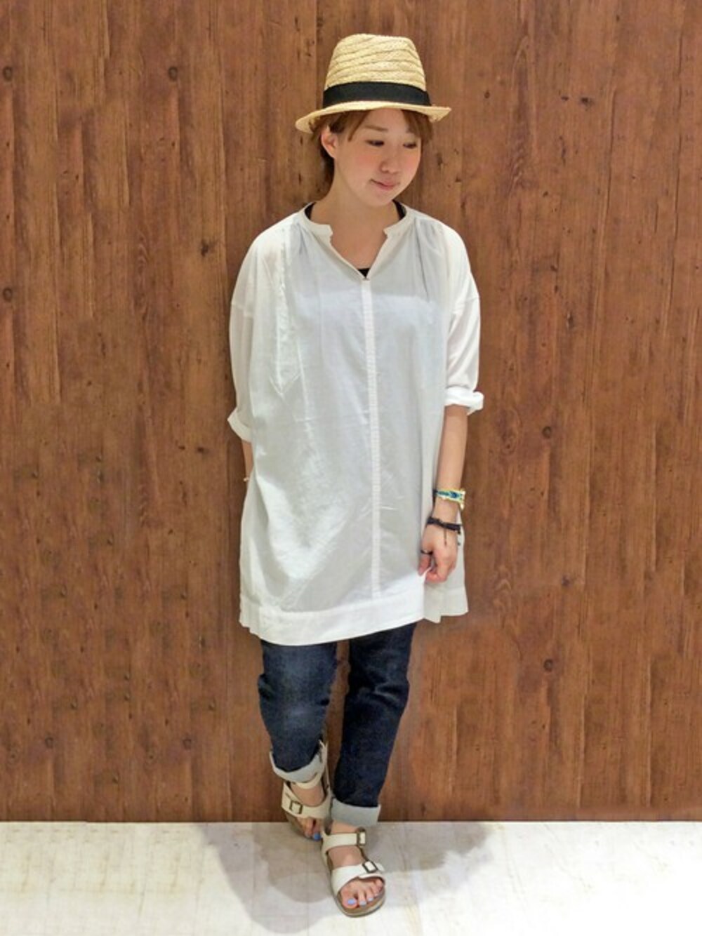 白シャツ×デニムのシンプルコーディネートです。 トップスは、落ち感のあるゆるシルエットがかわいいチュニック。綿素材でさらっとした着心地が今の季節にピッタリです。 デニムをロールアップさせて足首をみせつつ、ラフなサンダルとハットをプラスすると、こなれ感UPします♪