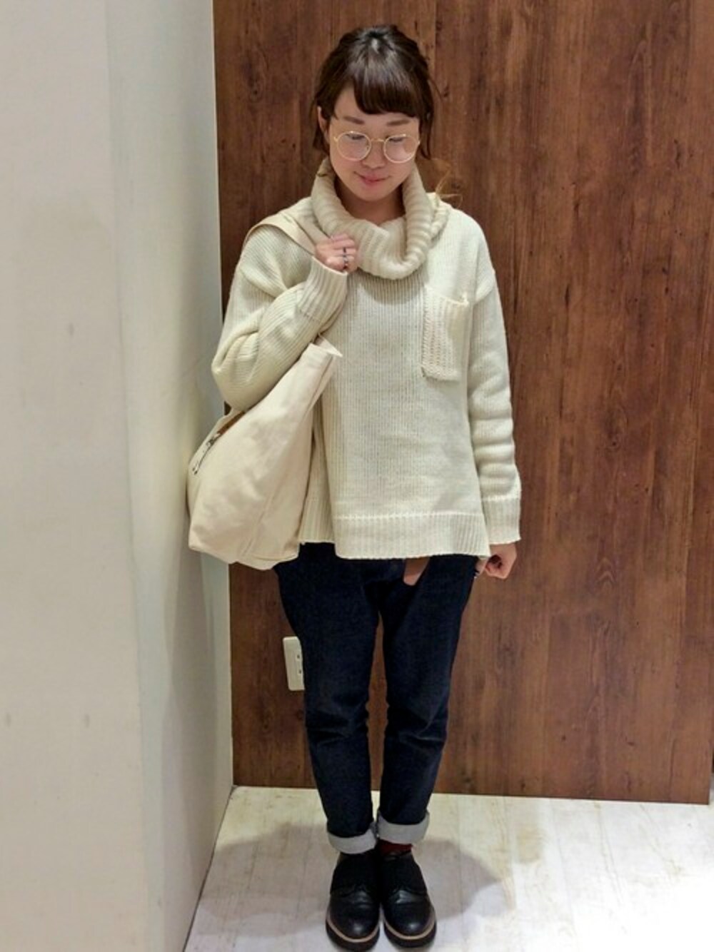 ざっくり編みのタートルニット。 あえてLサイズとチョイスし、細見のパンツをあわせました。 タートルが苦手でも、オフタートルは首回りの締め付けがなく取り入れやすいアイテムです。