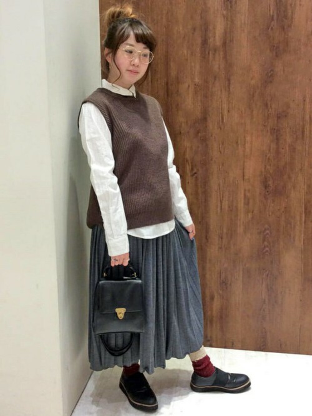トレンドのシャツ×ベストのクラシックスタイル。 長めのプリーツスカートとあわせると女の子らしさがプラスされます♪ カラーを抑えめにすることでカジュアルになりすぎず、おでかけにもおすすめのコーディネートです。 めがねやバッグなども少しレトロな雰囲気にまとめました。