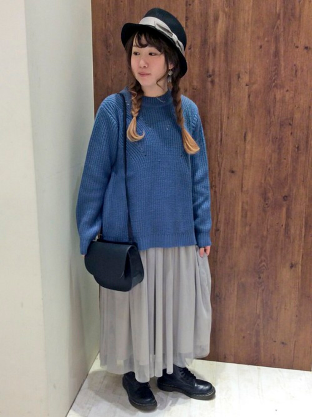 落ちついたブルー×グレーのガーリッシュなコーディネートです。 人気の畦編みニットは、今年らしいゆったりシルエットでスカートはもちろん、パンツとの相性も◎ 透け感のあるチュールスカートとあわせて女の子らしく♪ 小物はクロで全体のアクセントにしました。