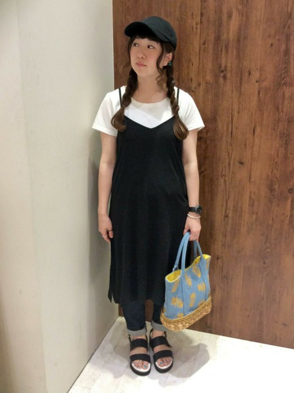 Tシャツ×キャミワンピスタイルでぐんっと今年らしい着こなしに◎ 黒でまとめて落ちついた雰囲気になってます。 さらにキャップでキャミのフェミニンさをカジュアルに落としてみました♪