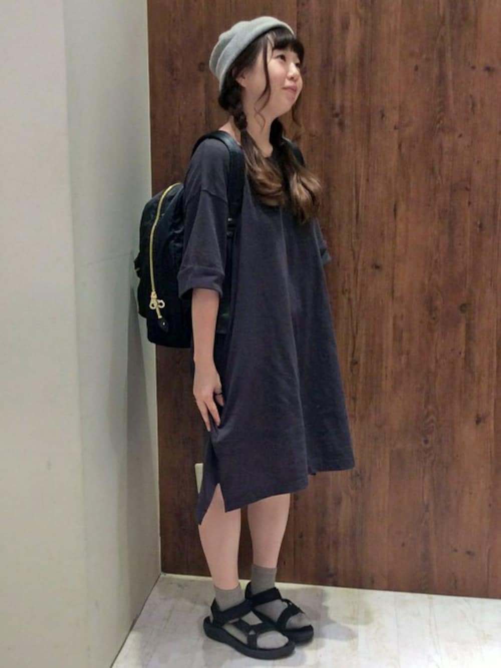 ゆったりシルエットのワンピースを主役にしたコーディネート。 ネイビー×グレーでまとめて落ち着いた雰囲気になってます。 スポーツサンダルやリュックでスポーツMIXスタイルにしてみました♪