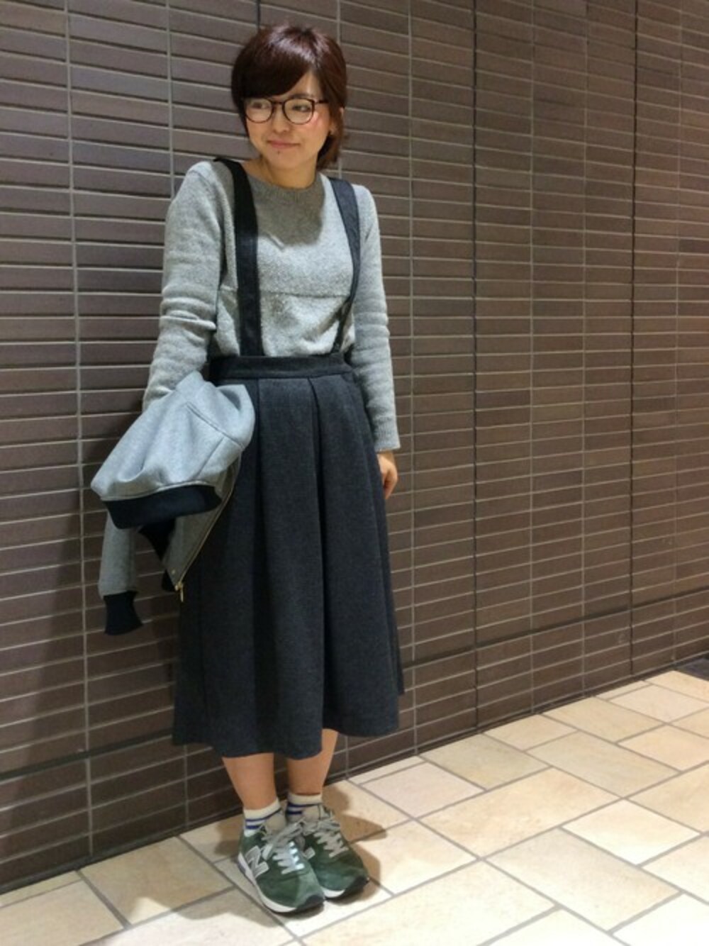 ニットをスカートインしてトレンドを取り入れたコーディネート。 グレーの濃淡のみで表現したコーディネートです。 サスぺンダーがついたジャンパースカートはトップスインスタイルのマストアイテム。 ウエスト横にあるボタンがさりげなくて可愛いです♪