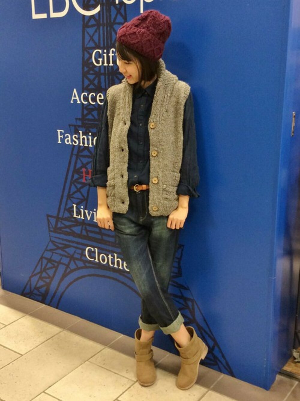今の季節にぴったりのニットベストをメインにコーディネートしました。 シャツとパンツをネイビーでまとめたので、ニット帽をボルドーにしてバランスをとりました。