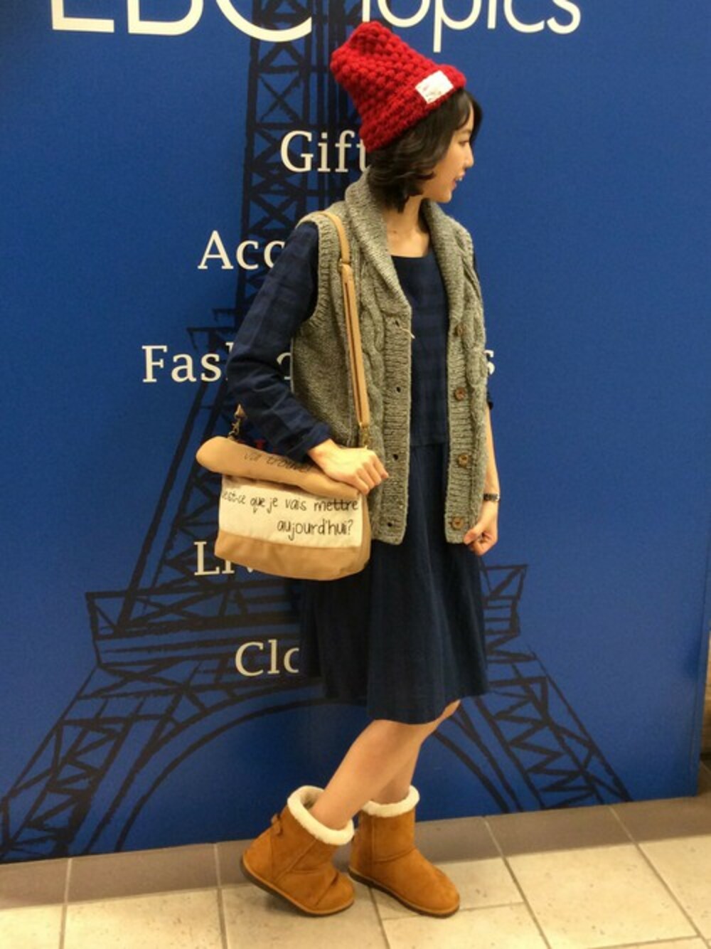 ニットベストとシャツワンピを合わせてフォークロアっぽくガ-リーに着こなしたコーディネート。 縦に入ったケーブル編みがポイントのニットベストは1点1点ハンドメイドで編まれた手の込んだアイテム。 ポコポコした編地のニット帽は赤色をセレクトし差し色にしました。