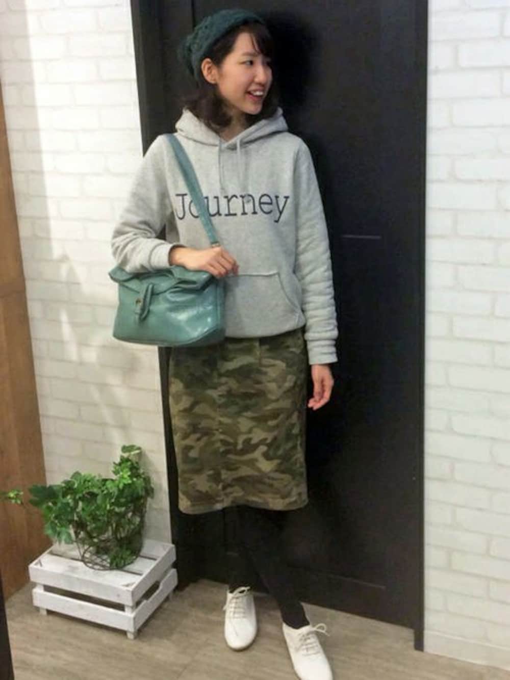 ロゴスウェット×カモフラスカートを合わせたトレンド感溢れるコーディネート。 カジュアルなコーディネートにはホワイトレースアップシューズをあわせてスタイルアップ。 ミントグリーンのバッグをプラスして春を先取り♪
