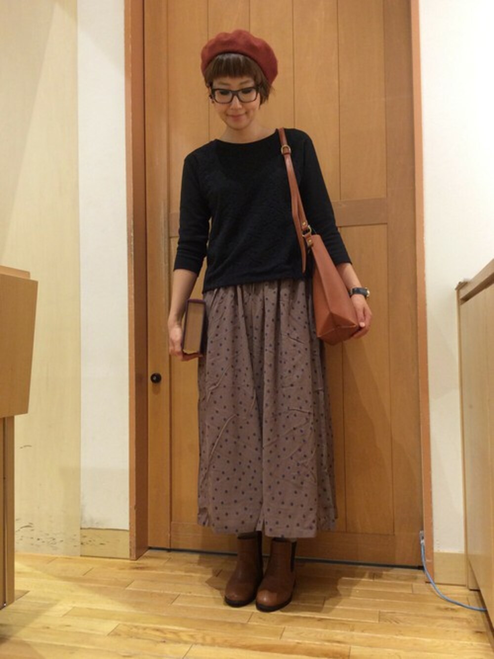 ドット柄のシフォンパンツが主役のコーデです。 フェルト地ベレーとサイドゴアブーツで季節感を出しました。