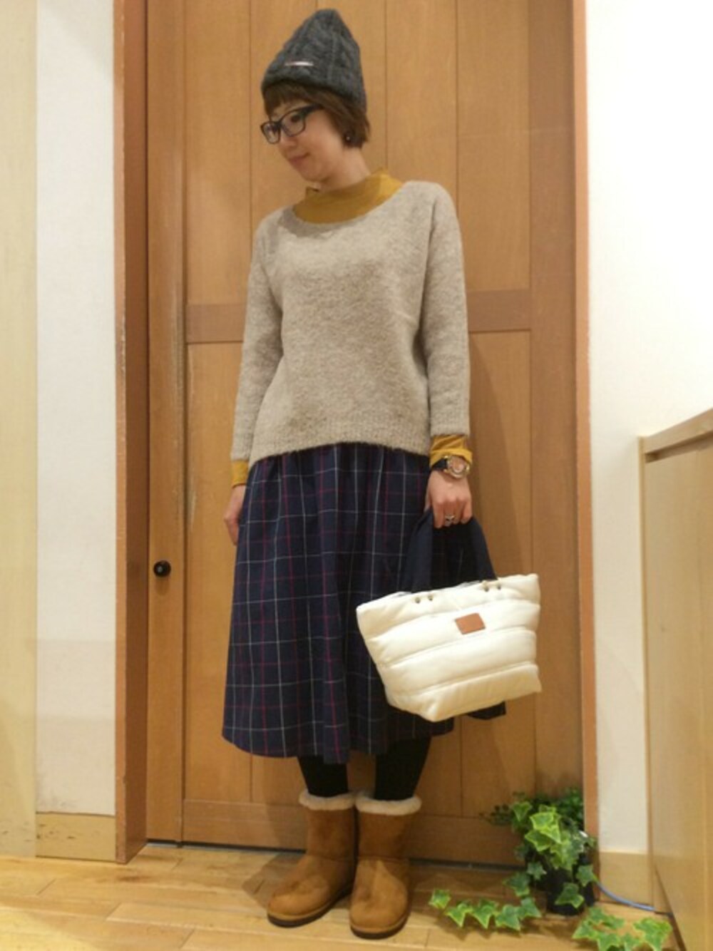 アルパカ混のニットに人気のちびハイネックTシャツを合わせた今年らしいスタイリング。 合わせたスカートも人気のミモレ丈とトレンド感満載です。 ボンディングバッグは冬のコーディネートに映えるホワイトが旬♪
