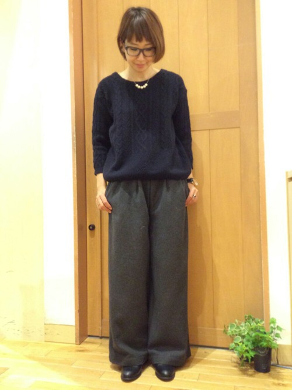 存在感あるワイドパンツが主役のコーディネート。 高い保温力が魅力のウールにポリエステルやレーヨン素材をブレンド! しなやかな風合いと、どんな動きもスムーズなので普段の着こなしにぴったりです◎ あわせたケーブル編みニットは、流行に左右されず、長く愛用出来る重宝間違いなしのニットです。