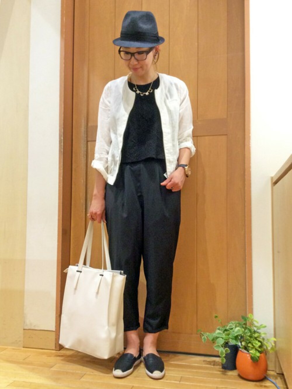 おとなのモノトーンスタイル。 リネンやレースを取り入れればハードな印象になりませんよ♪ インナーはレーストップスとテーパードパンツをドッキングさせた変形オールインワンです。