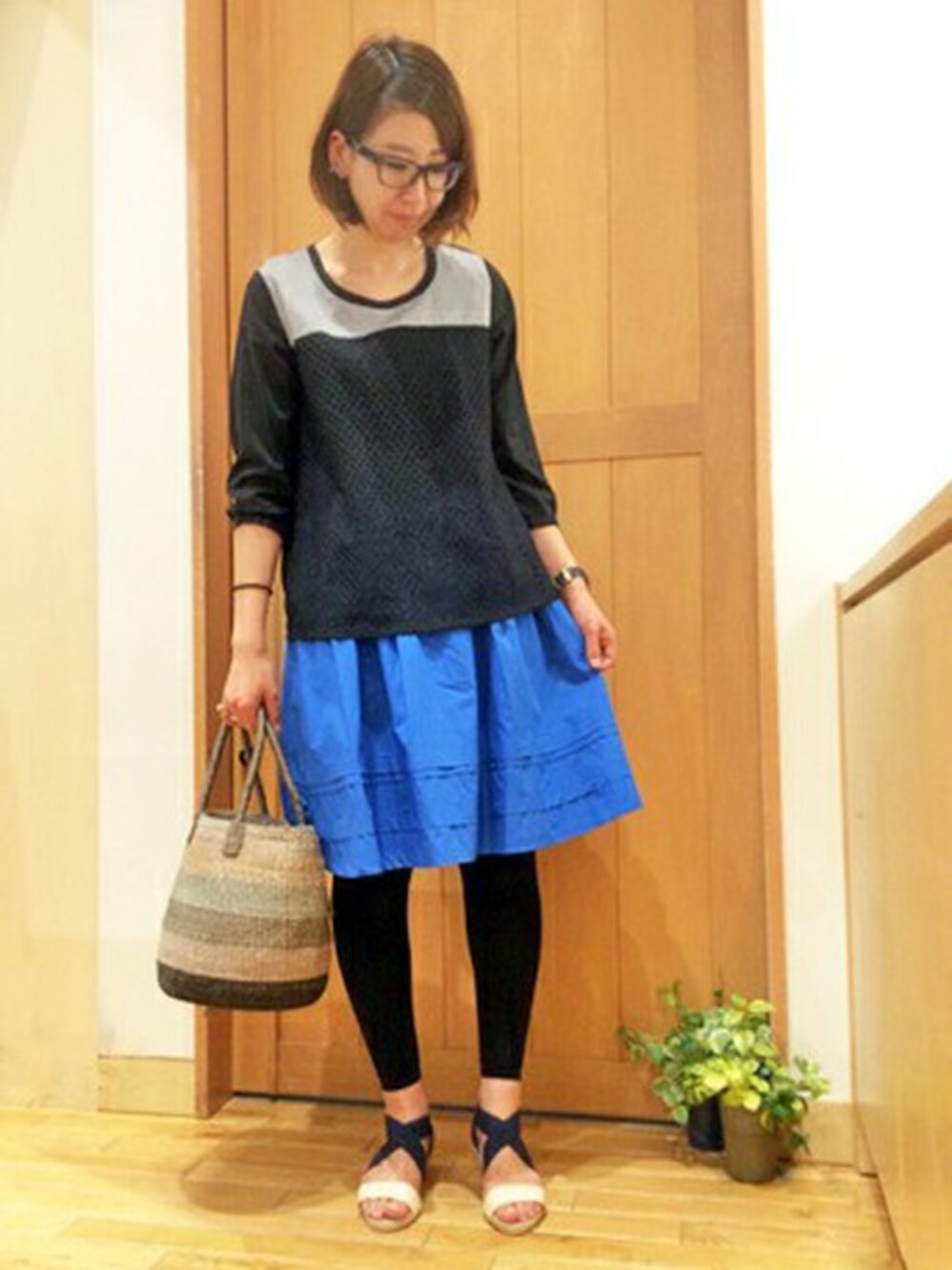 黒を基調とした初夏のモノトーンスタイル。 夏のシャツスタイルはスッキリ襟なしがおすすめ。 サンダルやかごバッグを合わせれば、黒も重たくなりません♪