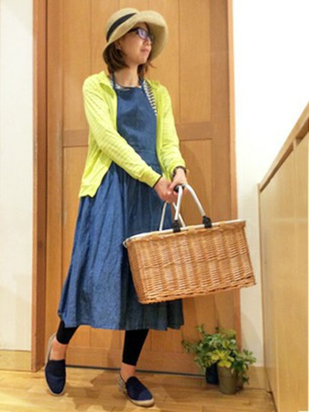 暑い夏の行楽やピクニックに、おすすめのコーディネートです。 トレンドのデニムワンピースは、エプロン型なので、後ろから見るとスカートみたいに見えるデザインになっています。 コットンリネンでさらりとした着心地、とっても楽ちんなのも魅力的♪ UVパーカーをはおれば、紫外線対策もバッチリです。