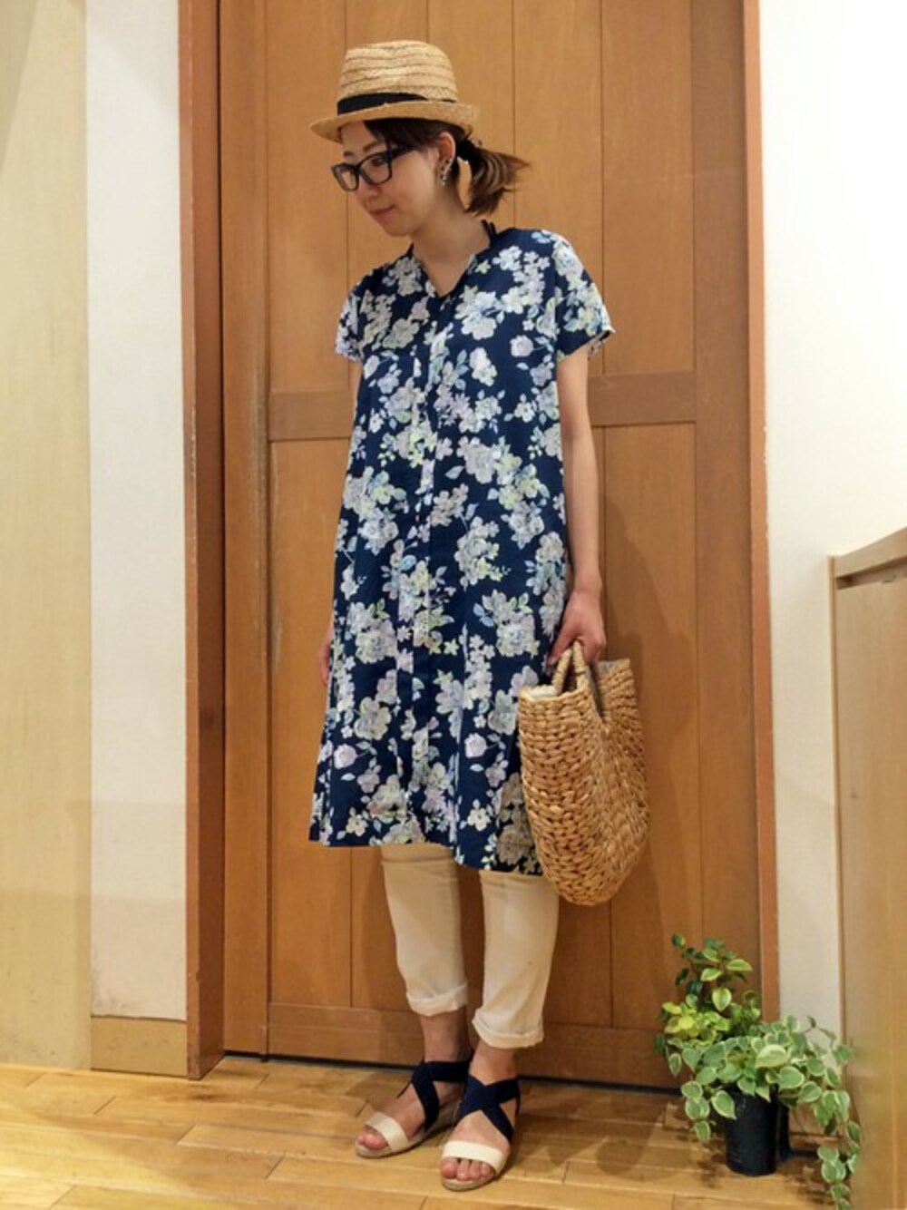休日のおでかけスタイル♪ ワンピースは、トレンドのボタニカル柄が印象的。ゆったりシルエットでリラックス感のある着心地です。 天然素材の小物をあわせると、よりリゾート感のあるコーディネートになります。