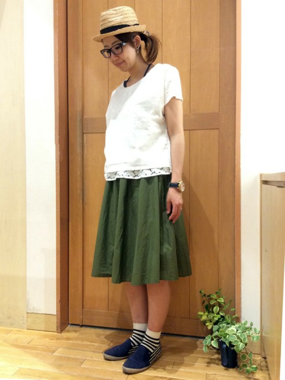 ホワイト×カーキが今年らしいスカートコーデです。 レースがかわいいトップスは、ほどよい丈感で、スカートパンツを問わずあわせやすいです。 たっぷりギャザーのはいったミモレ丈スカートは、無地とストライプのリバーシブルでその日の気分で着方をかえられるお得な一枚♪ 女の子らしいウェアなので、小物はちょっとメンズライクなアイテムをセレクトするのがおすすめです。