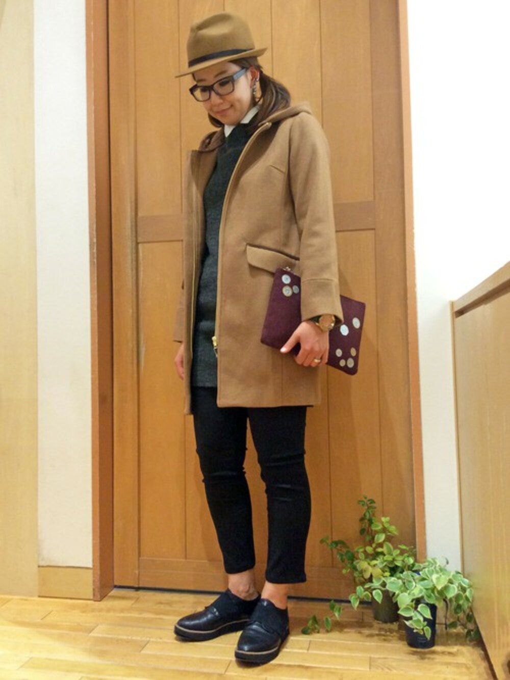 この秋冬人気のマニッシュコーディネート。 プレーンなシルエットのコートは、シンプルなデザインとフードの取り外しで着回しやすいアウターです。 インは、シャツ×ニットベスト。ベストのロングな丈が、こなれ感をプラスしてくれます♪ ハット&マニッシュシューズで小物使いもメンズライクにまとめてみました♪