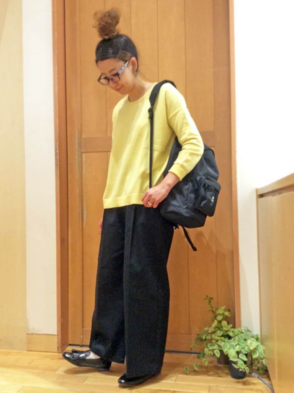 ブラックコーデに春カラーをプラス! 明るいイエローカラーのニットは、シンプルなデザインでカジュアルにもきれいめにも合わせやすい一枚になっています。 今回は、トレンドのワイドパンツやごつめのバックパックとあわせてマニッシュな雰囲気に♪