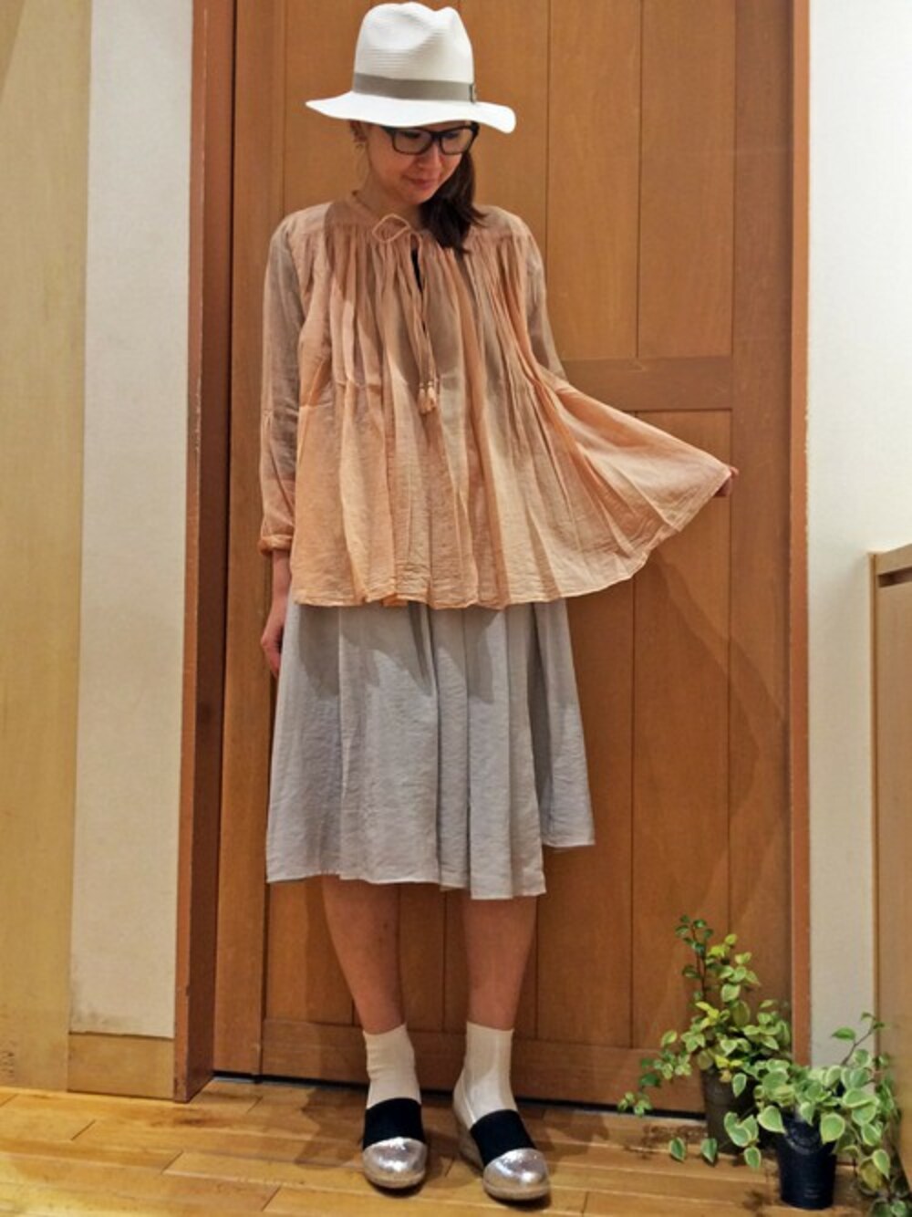 春らしさと女性らしさをミックスしたスカートコーディネート。 今年らしいオレンジピンクカラーのブラウスは、、一枚で主役になれるアイテムです。 ふんわりとしたコットンギャザースカートを合わせて、より女性らしいシルエットに。 ペーパーハットやジュートパンプスで春らしさをプラスしてみました。