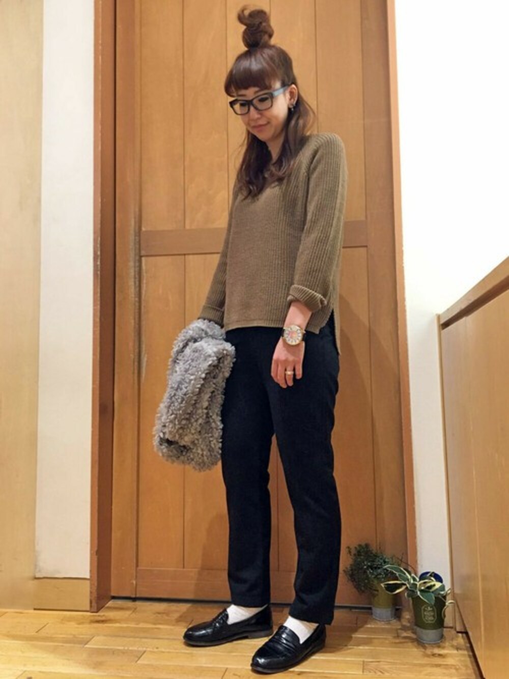 トレンドのブラウンにクロをあわせた大人カジュアルコーディネートです。 畔編みニットは、あたたかみのある素材感がポイント。 シンプルなデザインながら、ラグランの編地変化や前後差のある着丈など今年らしいデザインになっています。 足元はシロソックスを効かせると今年らしさがUPします♪