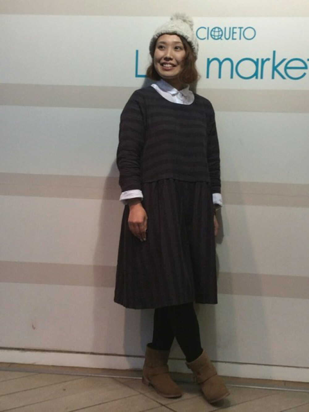 落ち着いた配色のワンピースをメインにブラウン・ベージュの同系カラーでコーディネート。 ワンピースはウエストでボーダーとストライプの切替になっていてカワイイです。 ざっくりしたシルエットなのでインナーにシャツをあわせても窮屈感なくご利用できます。