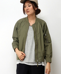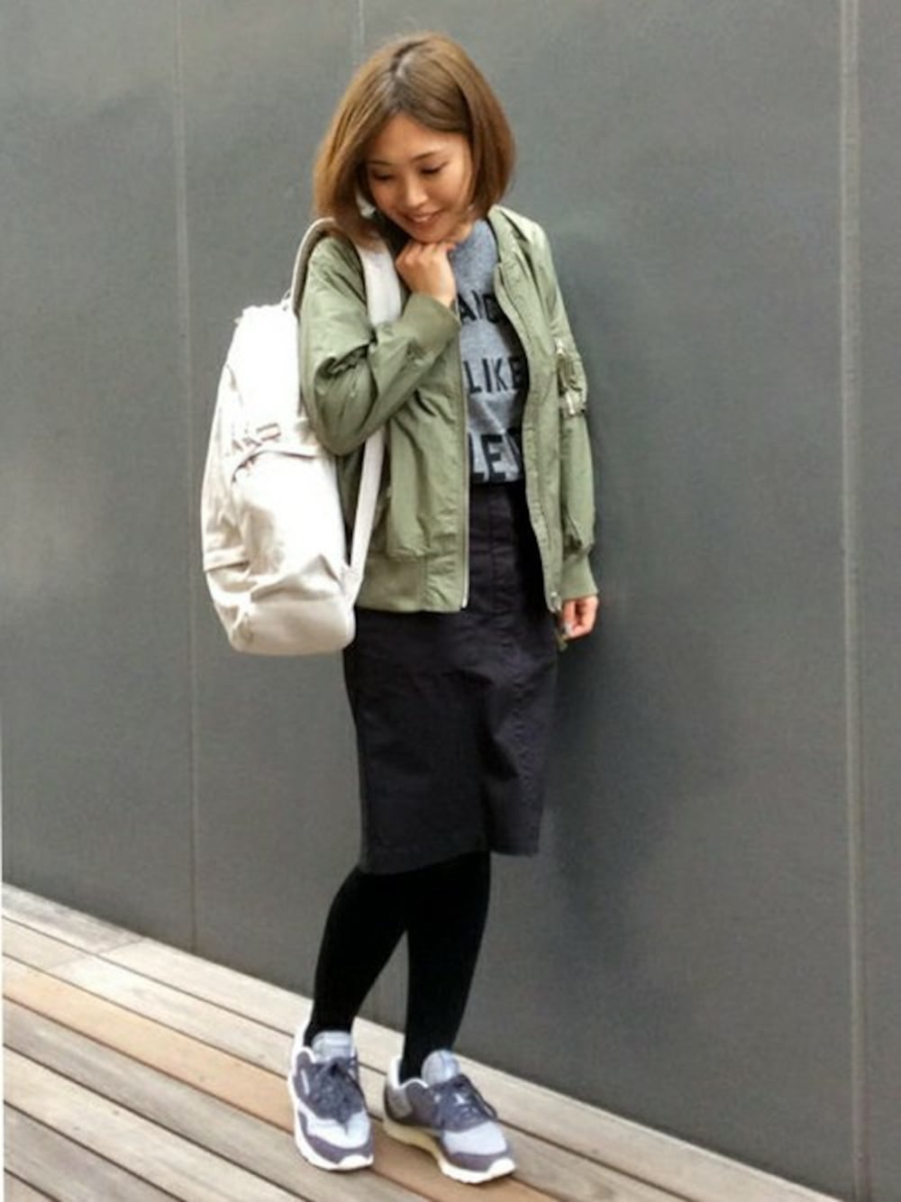 MA-1×スカートの、ミリタリーガールズコーディネート。 グレーのインナーとスニーカーが、全体のバランスを上手くまとめてくれてます。 インナーをゆるくトップスインすると、女性らしさがさらにUPします♪ 全体にダークカラーのスタイルなので、バッグは春らしい白リュックを合せました。