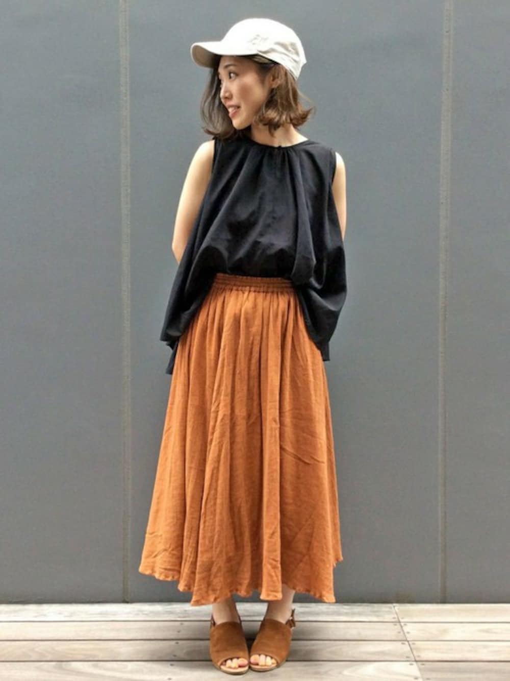 秋カラーでまとめたスカートスタイル。 ノースリーブのブラウスをボリュームのあるスカートにトップスインしバランス◎ キャップでカジュアルダウンしてみました♪