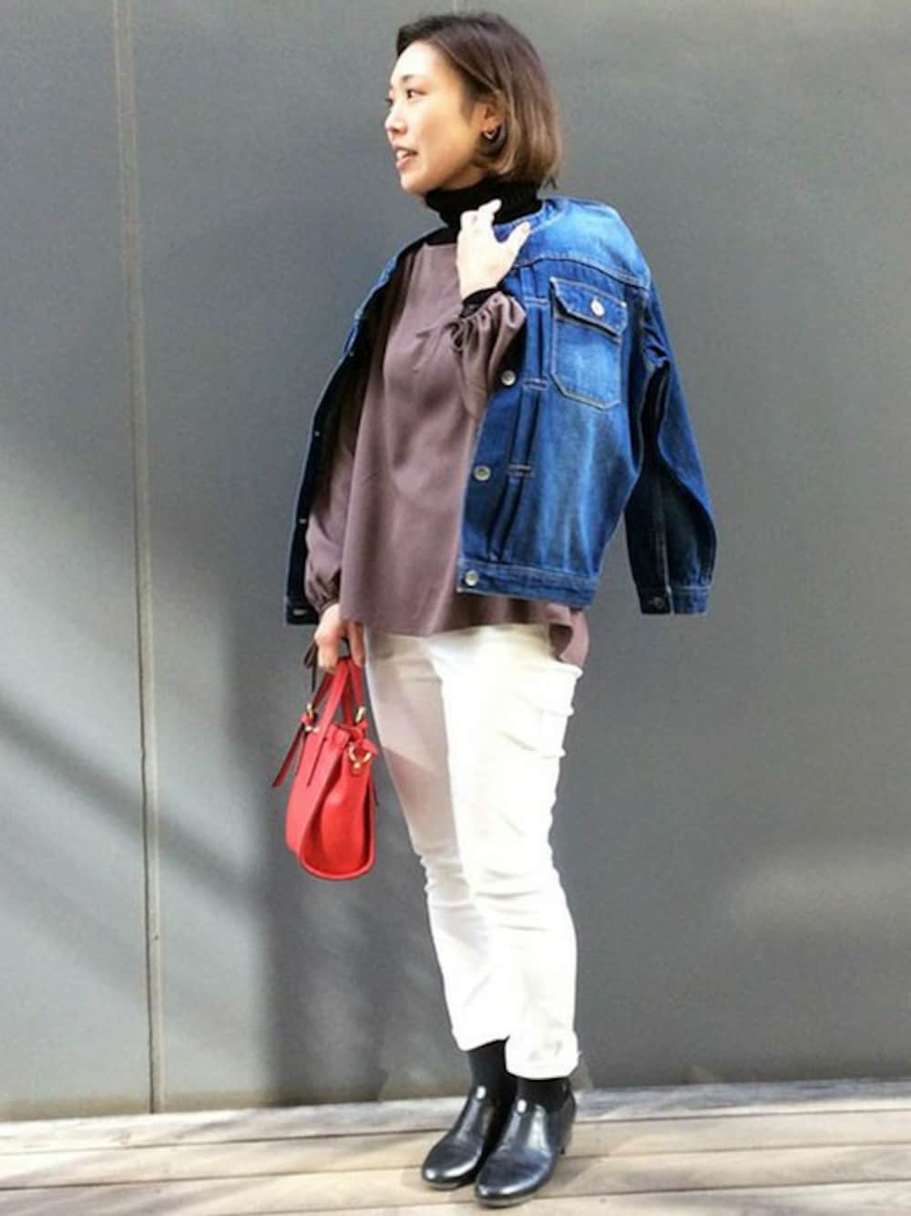 大人の女性らしい春のパンツコーデ。 春アウターの定番であるGジャンも、ノーカラーデザインなら子供っぽくならずに着こなせます♪ ホワイトパンツでシンプルにあわせつつ、元気カラーのバッグをアクセントにしました。