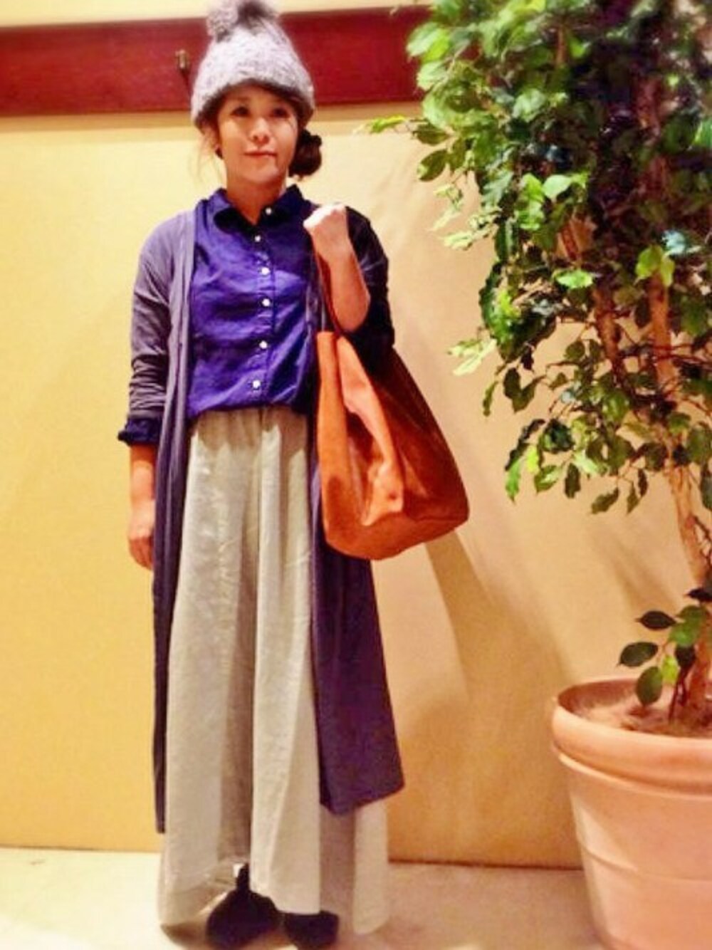 ゆったりリラックスなアイテムが多いですが、 マキシ丈カーディガンで着痩せ効果バッチリのおすすめコーデです。 ボトムはスカート見えしますがパンツです。