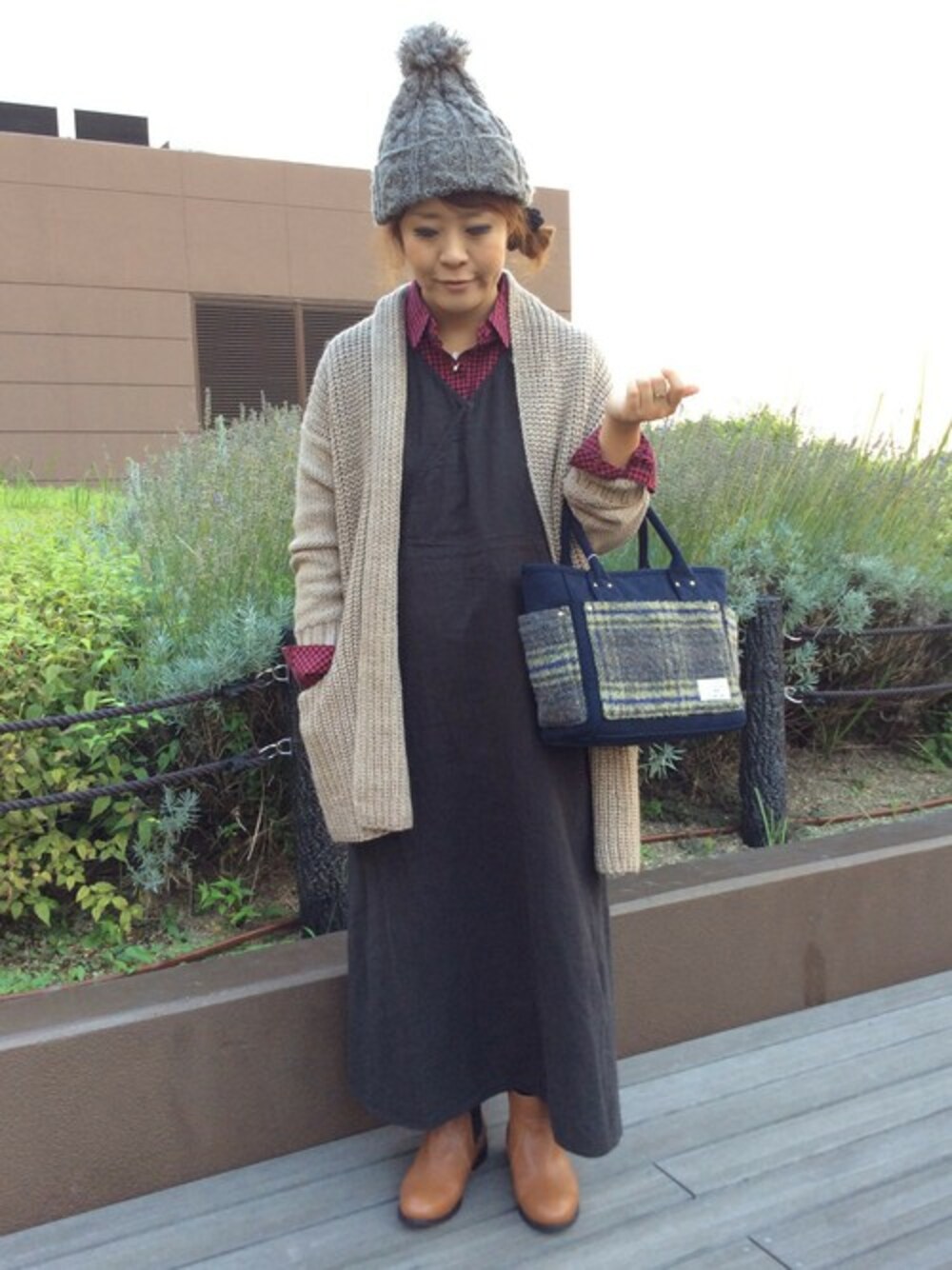エプロン素材のワンピースにざっくりニットの羽織でリラックススタイル。 毎日使いたいコーデを意識しました。