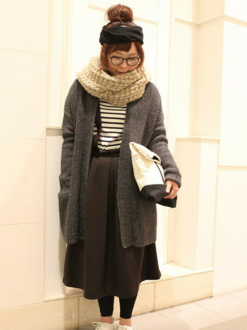 冬らしくニットを多く取り入れたスタイリング。 ニットのトッパーカーディガンはざっくり縦長ラインで女性らしいアイテム。 トップスはサス付きタックスカートにインしてすっきりバランスをとりました。