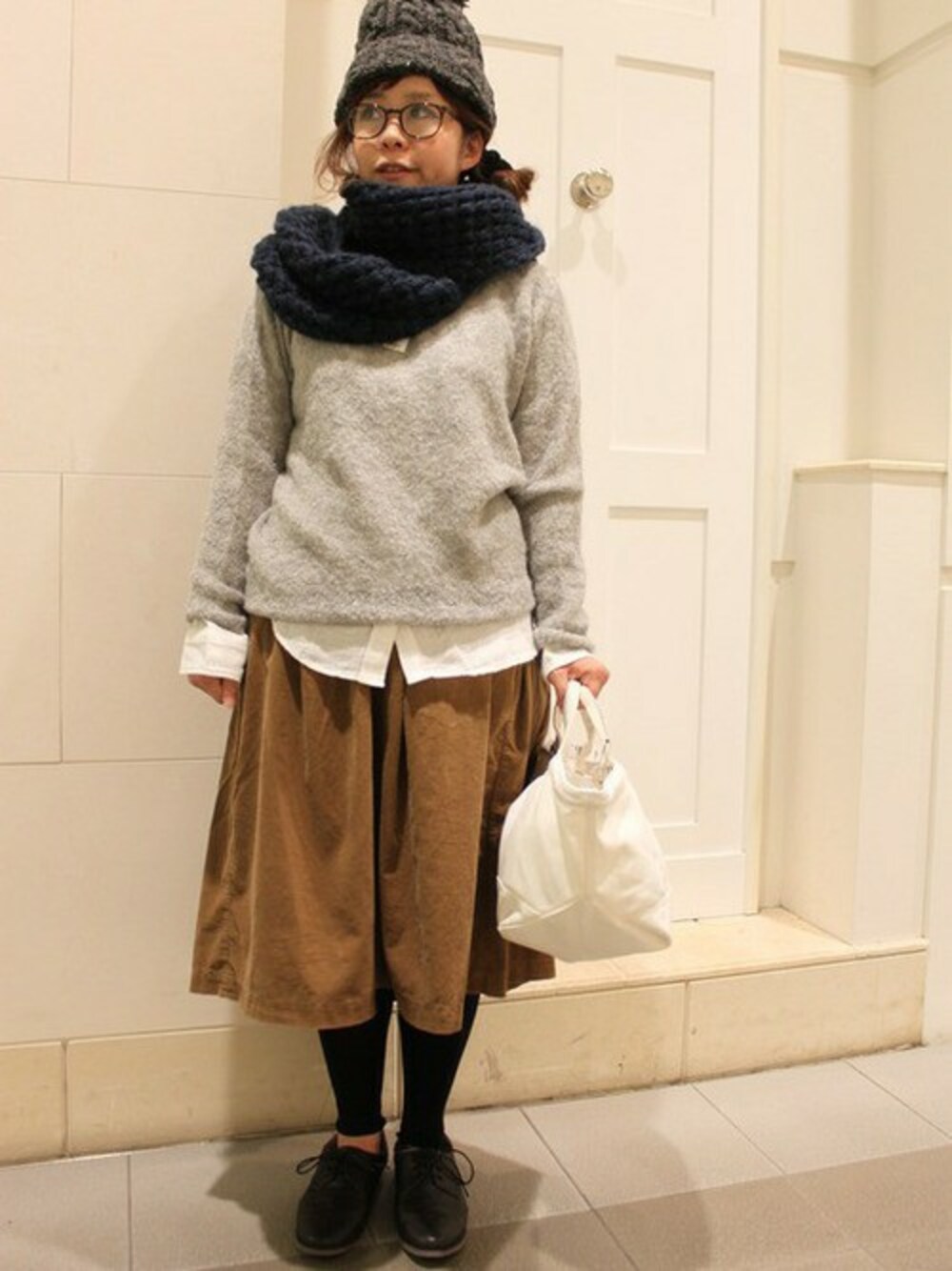 ダーク系を避けてニュアンスカラー優先のコーディネート。 柔らかみのある「ライトグレー」のアルパカニットで温かさを。 「キャメル」カラーのコーデュロイ素材で深みと奥行きを加えております。