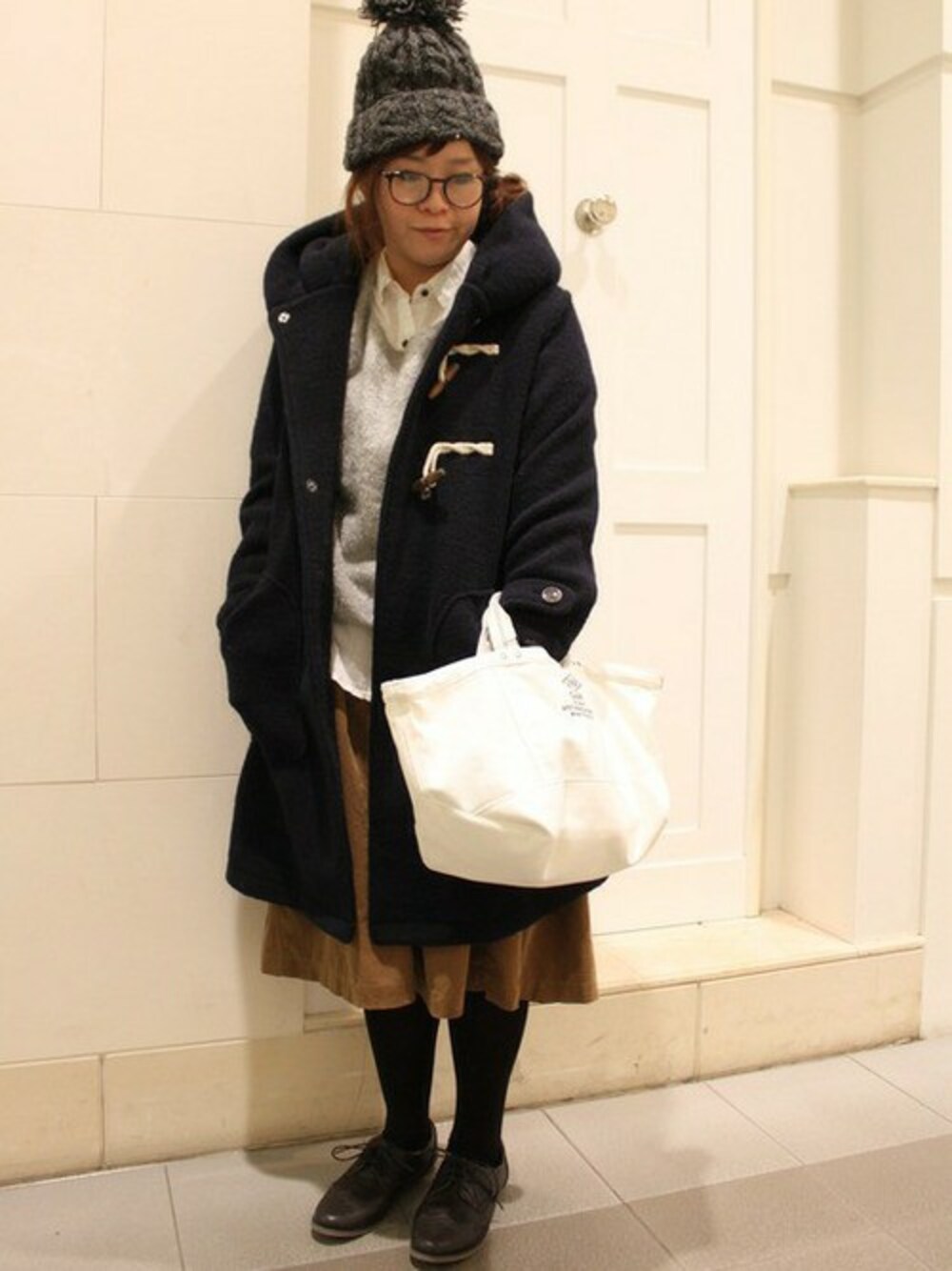 ロング丈のダッフルコートをメインにしたコーディネート。 トグルを高い位置設定しおとなっぽい雰囲気。大き目フードで小顔効果があります。 バッグは白をチョイスしコーディネートに軽さを出しました。