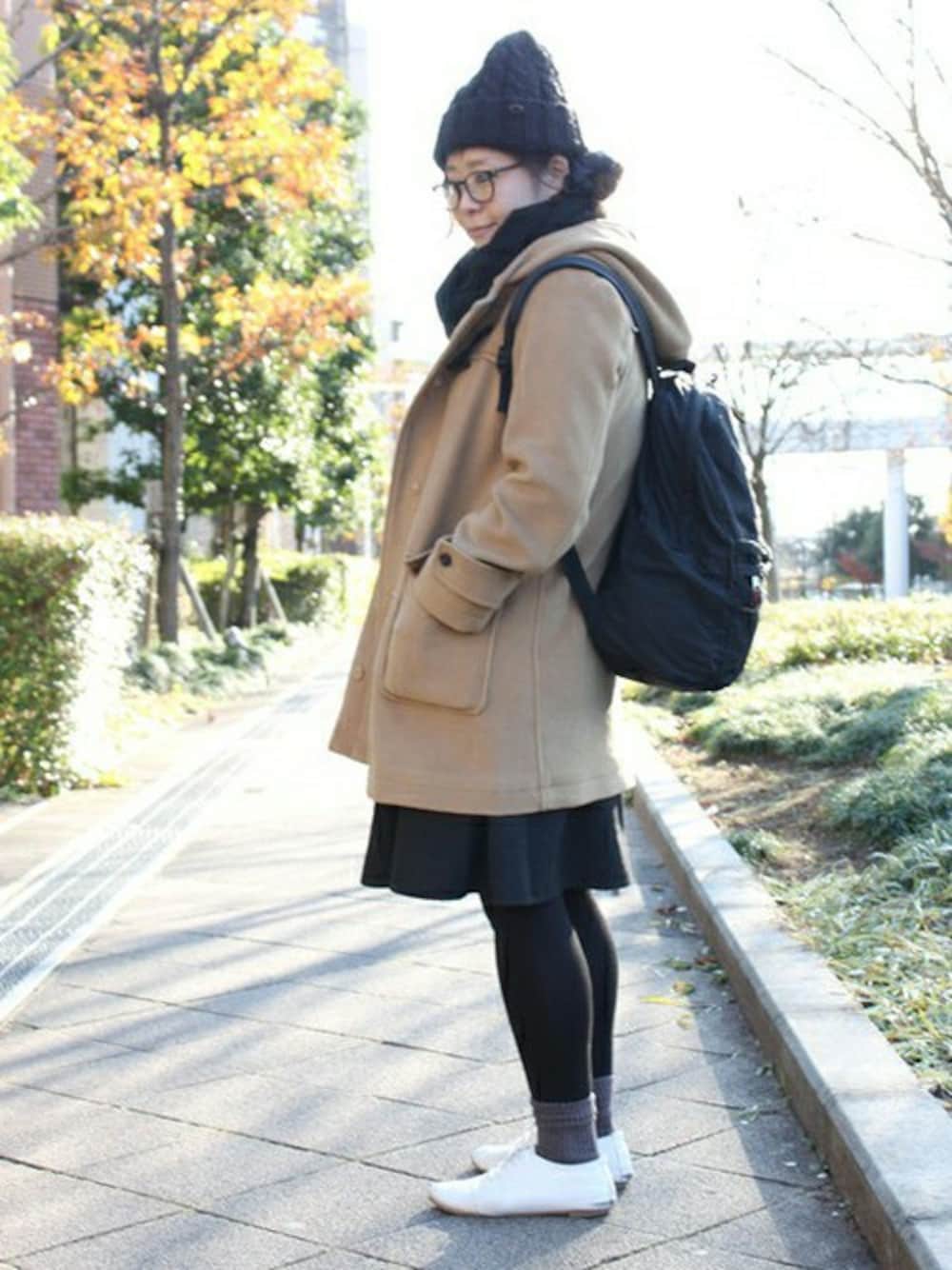 ワンピース×ロングダッフルの長いアイテムをまとめたスタイリング。 ブラックコーデにベージュのアウターを合わせた今年らしい色使いです。 ロングダッフルは細見え×ハリ感のあるおとなの為の1着です。