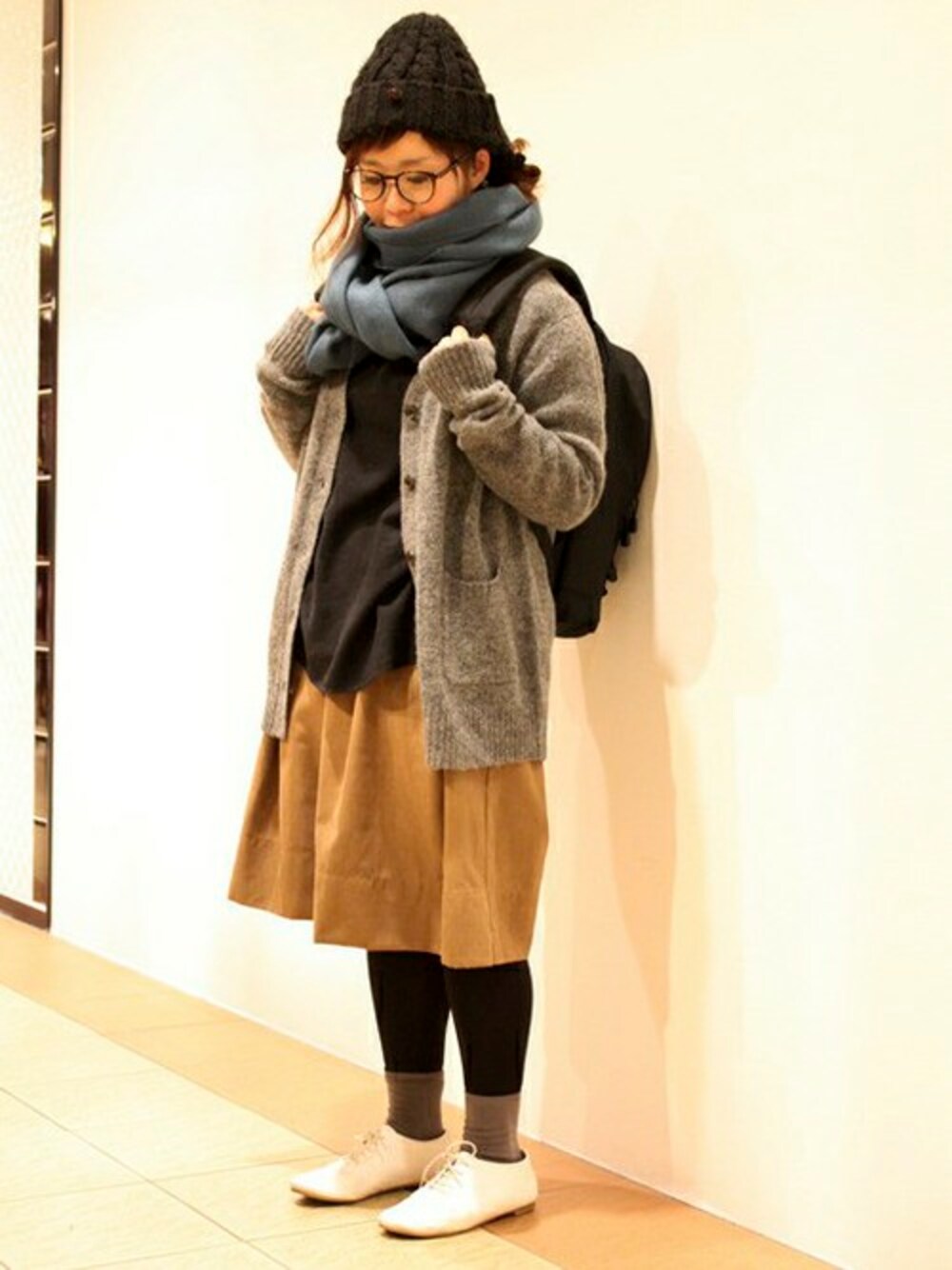 あったかレイヤードスタイリング。 多くのアイテムをまとめるには、ベースとなるダークカラーを決めてベースに使うと、きれいにまとまります。 首にぐるぐる巻きにしたマフラーを差し色にして、ポイント使いしました♪