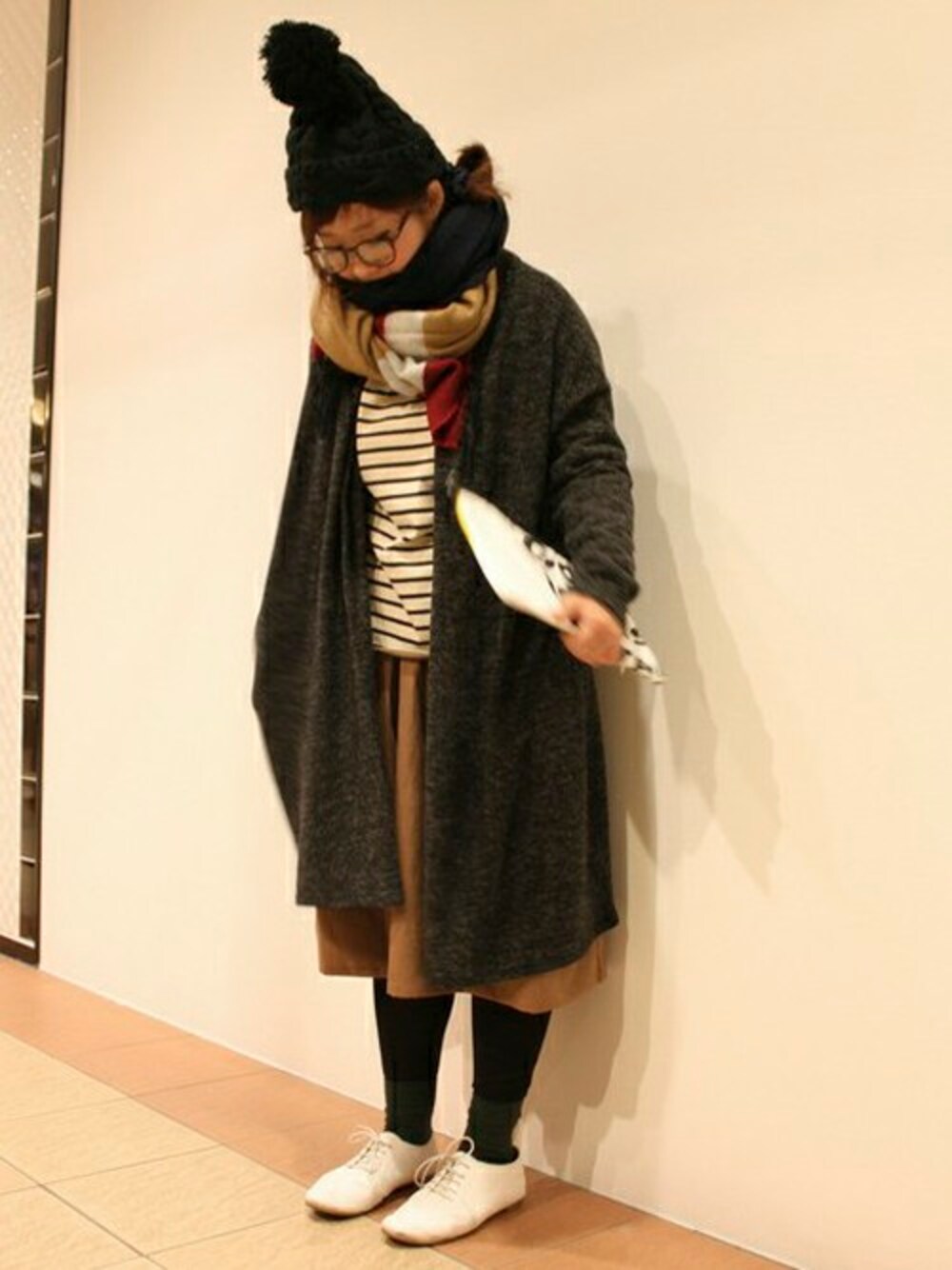 ナチュラルなコーデにざっくりしたニットのロングカーディガンを合わせたスタイリング。 ダーク系のカラーにホワイトカラーをポイント使いしてバランスをとりました。 首回りはマフラーをスヌード風に巻きあったか+小顔見せ♪