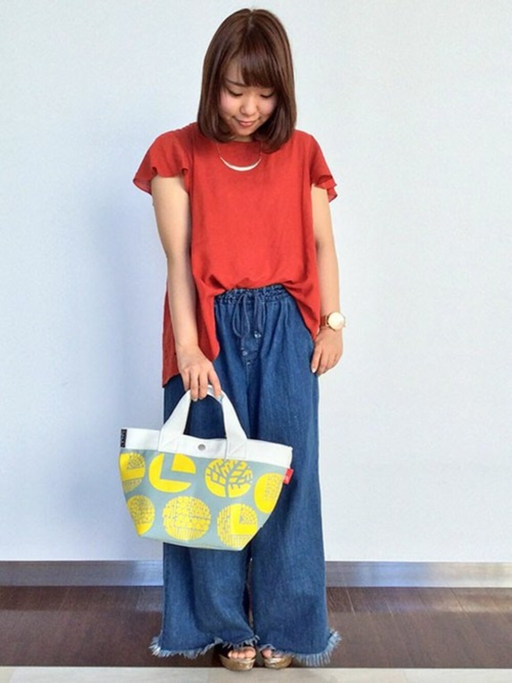 カジュアルに見えがちなアカもフリル袖&バックのレース切替えでフェミニンンな雰囲気のブラウス。 後ろ丈が少し長めで気になるヒップもおしゃれにカバーしてくれます。 切りっぱなしの裾が今年らしいデニムワイドと、インパクトのあるイエローが効いたバッグで大人カジュアルコーデ完成です♪