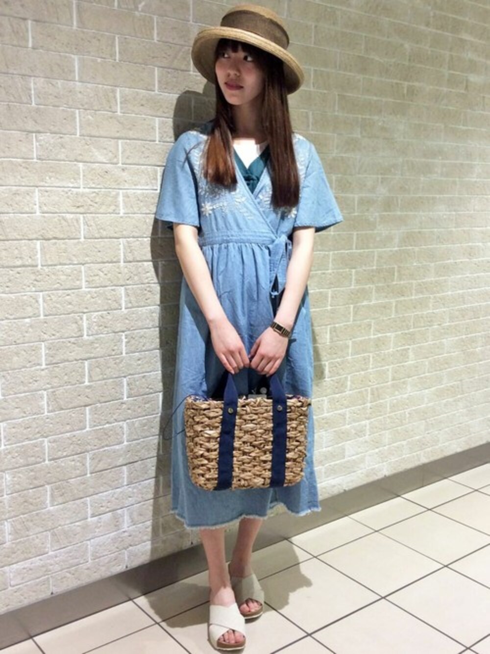 夏のおでかけワンピーススタイル。 デニムワンピースは、前を開けるとトレンドのガウンとしても着まわせる一枚。 夏素材の小物をあわせるとリゾート感がUPします♪