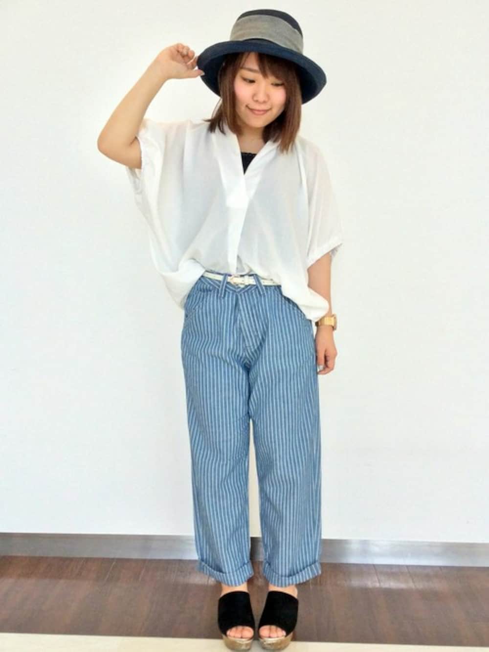 夏のさわやかカジュアルコーディネート。 シロ×ブルーの定番スタイルも、ヒッコリーでイメージも一新♪ スキッパータイプのブラウスなら子供っぽくならず、おすすめです。